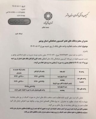 به گزارش ندای استان،طبق اعلام کمیسیون هماهنگی باتک های استان بوشهر، شعب بانکی از شنبه تا چهارشنبه ساعت ۷ تا ۱۳:۳۰ به مشتریان خدمات دهی می کنند.