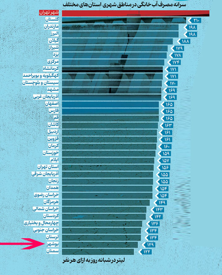 تنها استان سمنان با سرانه مصرف ۱۲۲ لیتر رتبه پایین تر از بوشهر دارد.