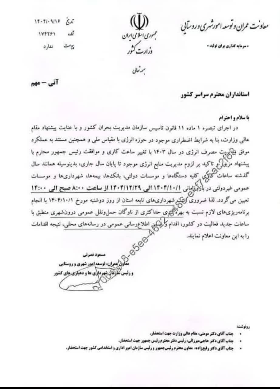 به گزارش ندای استان،این تصمیم به استناد «شرایط اضطراری حوزه انرژی» و با هدف مدیریت مصرف برق و گاز کشور اتخاذ شده است. وزارت کشور همچنین تأکید کرده دستگاهها مکلفاند برنامهریزی لازم را برای جلوگیری از اختلال در ارائه خدمات عمومی انجام دهند.