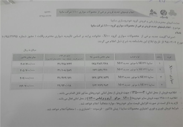 همچنین قیمت جدید سایپا ۱۳۲ مدل SE با موتور جدید با افزایش ۵۷۰ هزار تومانی معادل ۲۰ میلیون و ۵۷۰ هزار تومان تعیین شده است.
